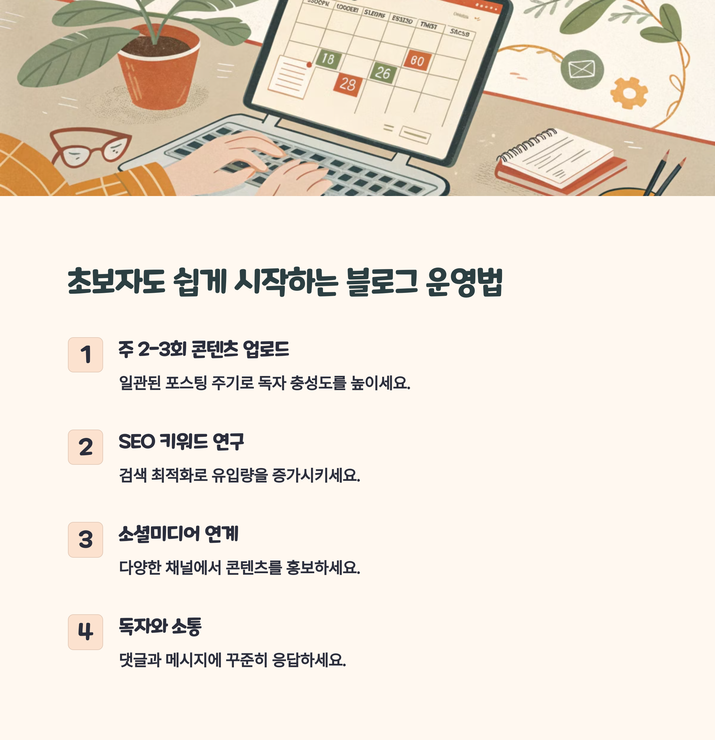 처음에는 너무 욕심내지 말고, 하루 1포스팅씩 정보형 콘텐츠 위주로 꾸준히 작성하는 게 좋아요.
