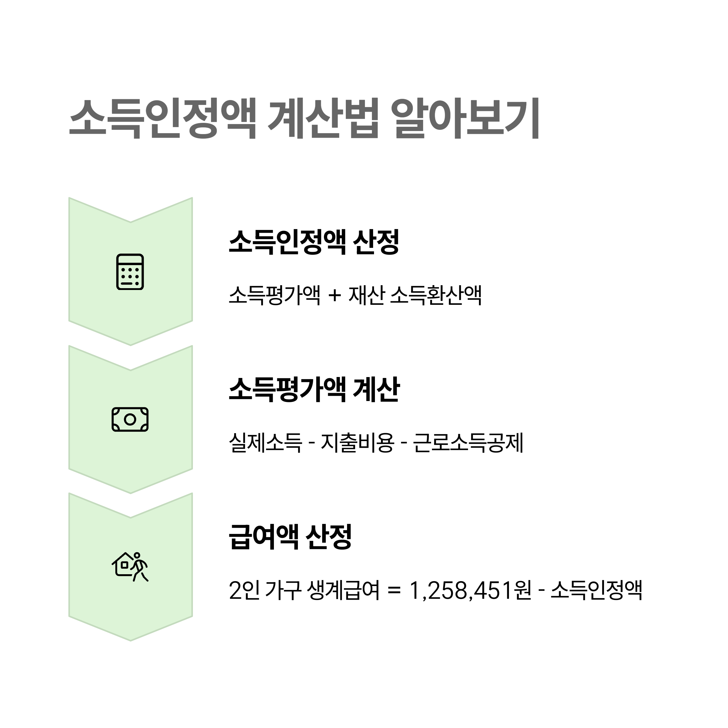예를 들어 1인 가구라면 소득인정액이 66만 원 이하, 2인 가구는 약 110만 원 이하일 경우 생계급여 수급 가능성이 있어요.