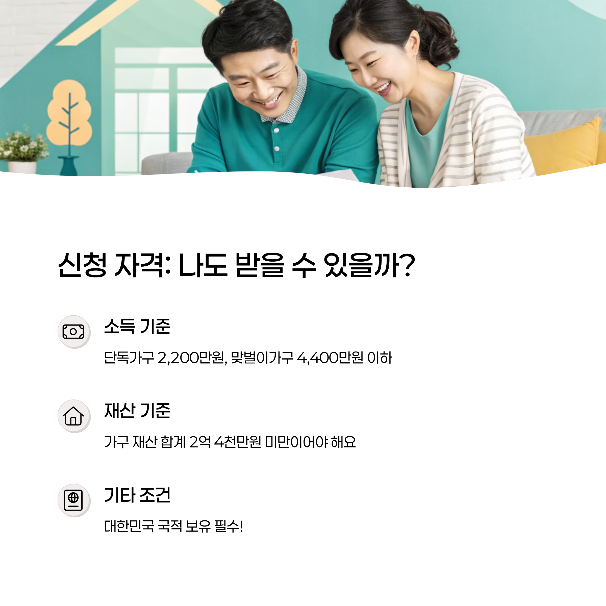 2025년 기준, 총 3가지 요건을 충족해야 해요: ① 가구 유형, ② 연간 총소득, ③ 재산 조건이에요.