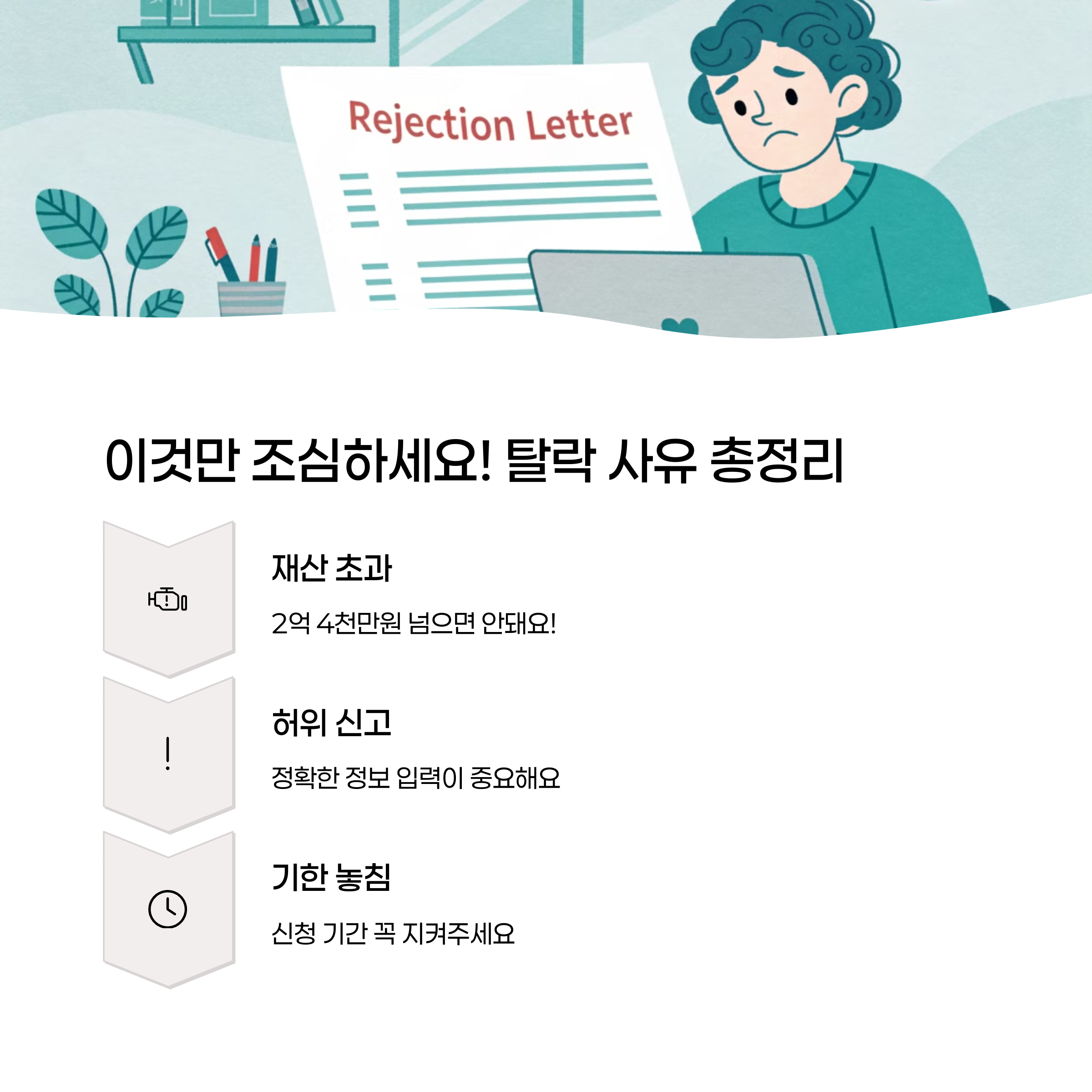 대표적인 탈락 사례는 재산 기준 초과예요. 신청일 기준 가구원 합산 재산이 2억원을 넘으면 자동 탈락돼요.