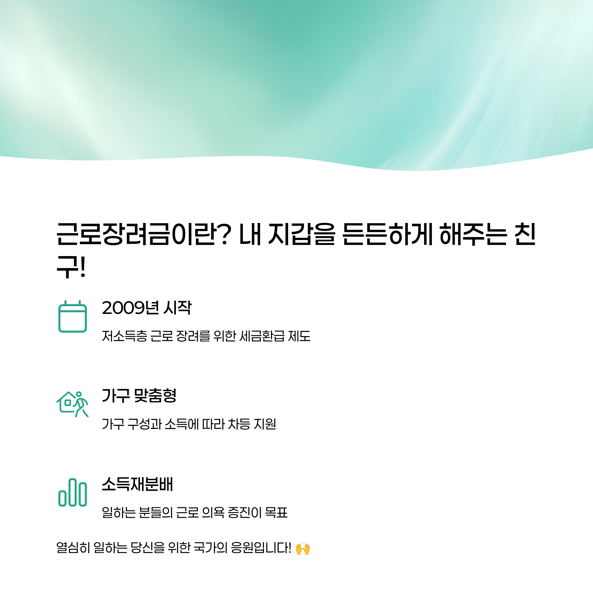 이 제도는 단순한 복지가 아니라, 근로를 장려하고 자립을 응원하는 의미가 있어요. 그래서 소득이 적지만 노력하고 있다면 꼭 신청해야 해요!