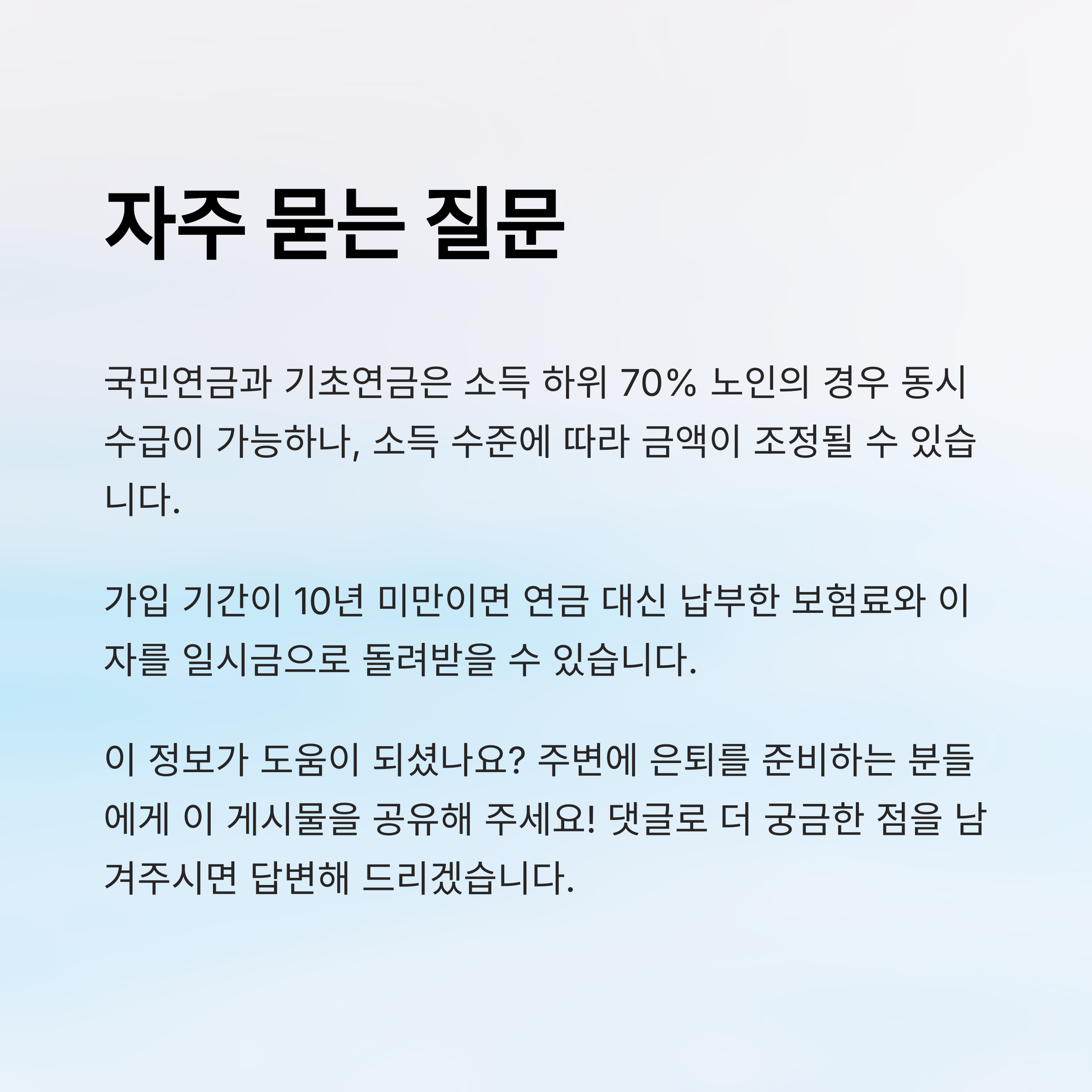 즉, 연금은 단순한 노후보장제도 그 이상이에요. 삶의 다양한 상황을 반영하는 복지 안전망이라는 점에서 정말 유용해요. 🤝